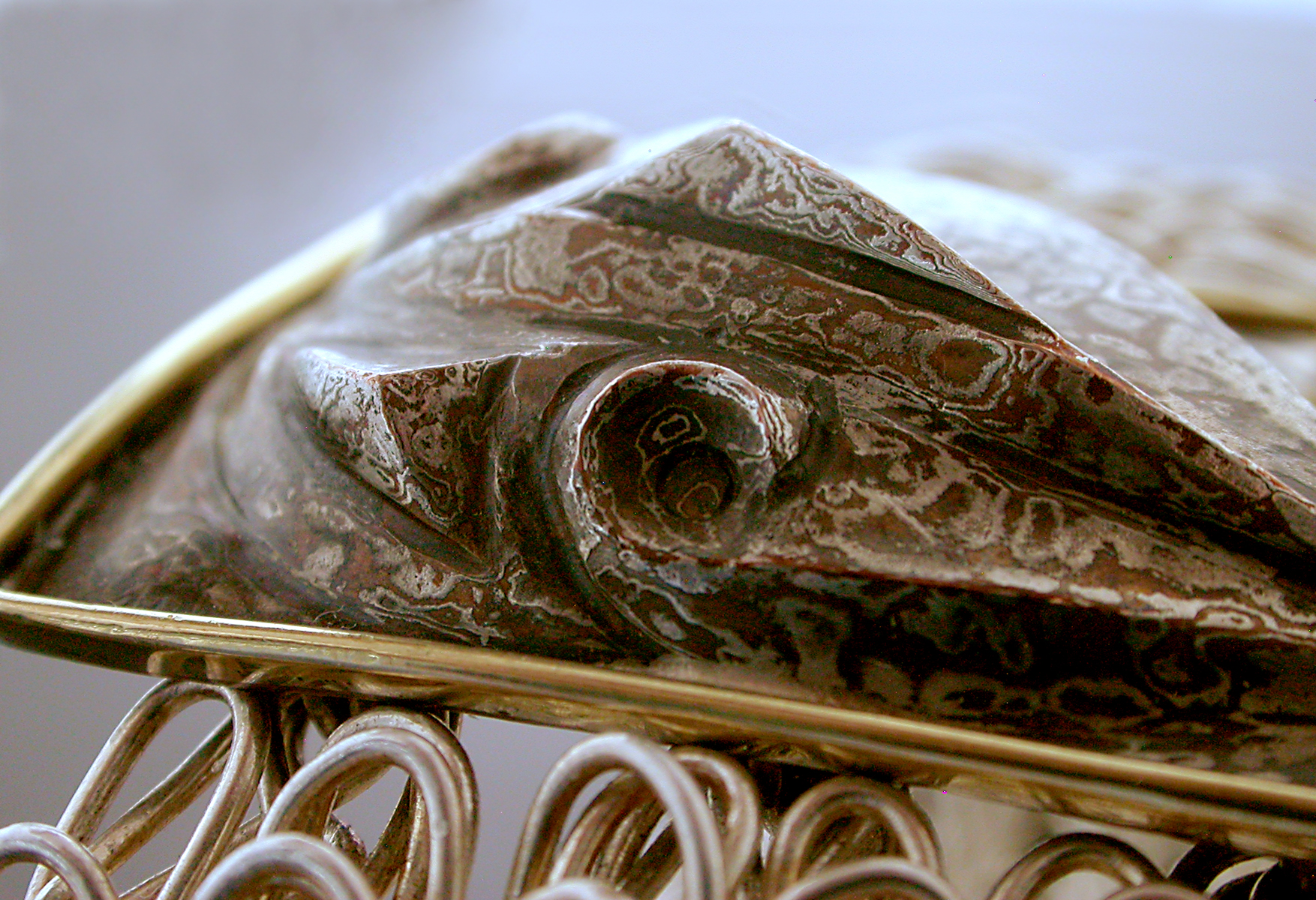 Mokume Gane: A laminate technique composed of fused sheets of varying alloys that are hammered, carved, and/or filed to expose a cross section, creating unique patterns. This technique is similar to damascene steel (pictured in photos above).